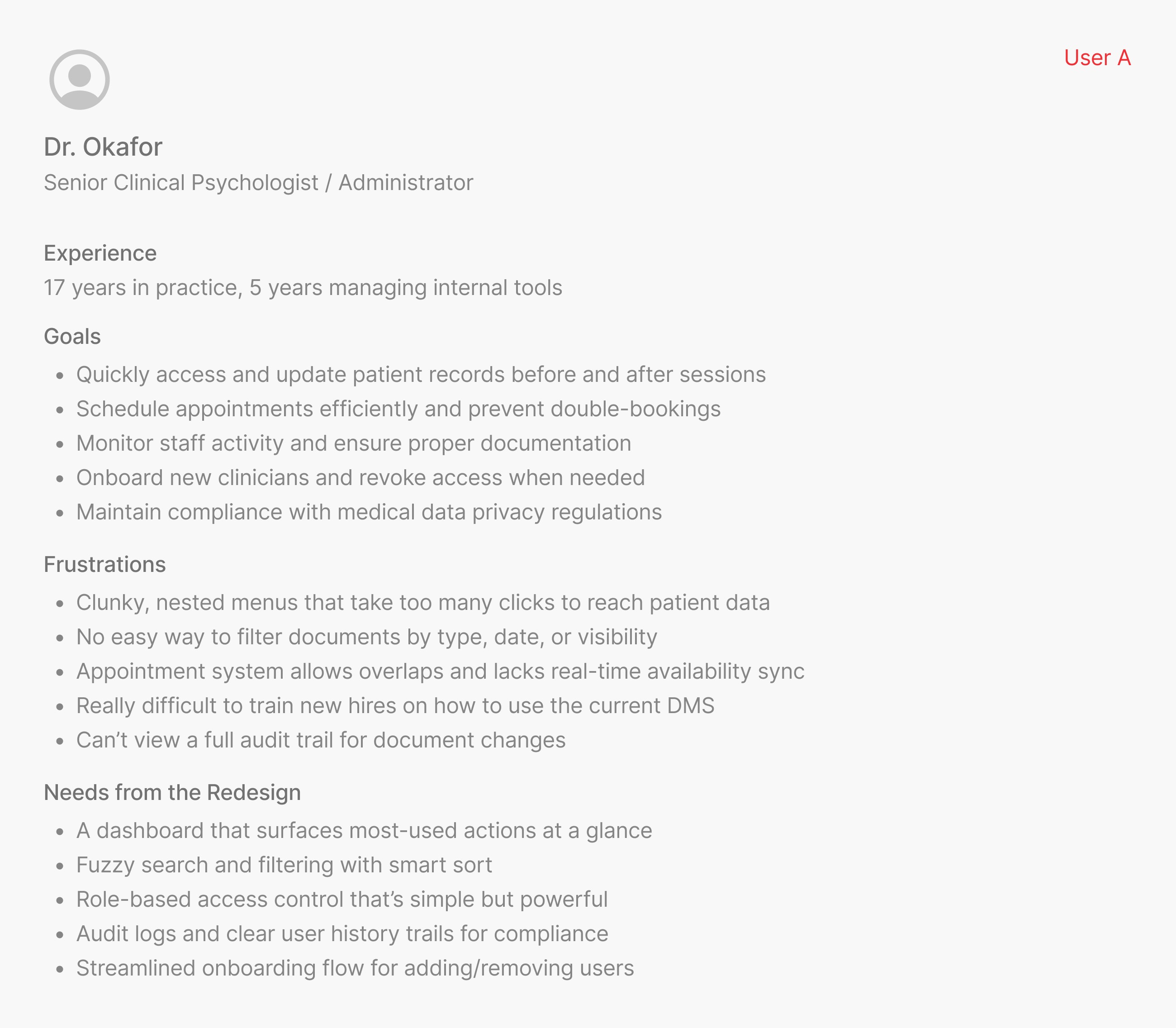 Based on this, I defined two core user personas: Admin Staff (power users) and Patients (casual users), both of whom needed faster onboarding and smoother task execution.